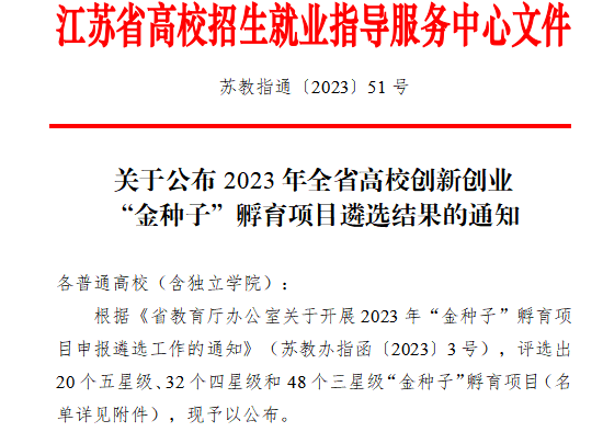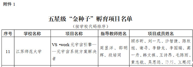 近日,由江苏省教育厅主办、省高校招生就业指导服务中心(以下简称省招就中心)负责组织实施的2023年度江苏省“金种子”孵育项目遴选结果公布,我校报送的智慧教育学院“VS·work元宇宙引擎——元宇宙系统方案解决者”项目成功入选最高级别“五星级”孵育项目(全省20项)。