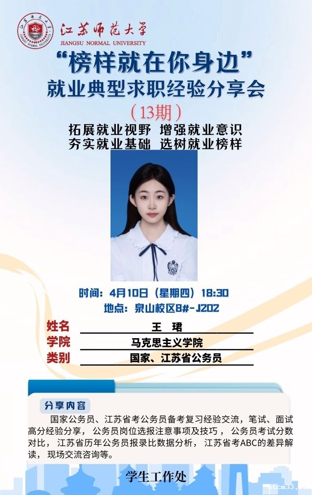 王珺,女,马克思主义学院2021级思想政治教育(师范)专业,2025年国家公务员笔试139.2分,江苏省公务员报考岗位总成绩第一。