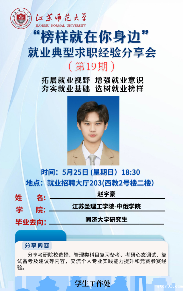 为增强学生就业意识,拓宽就业视野,夯实就业基础,学生工作处结合学生关注度高、求职意愿强烈的行业领域,开展“榜样就在你身边”2025届毕业生就业典型求职经验分享系列活动,充分发挥朋辈榜样的示范引领作用,帮助更多的学生提升就业竞争力。经学院推荐、学校遴选,现将第十九期活动开展相关情况通知如下: